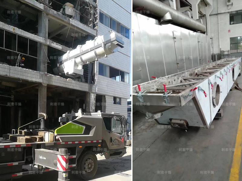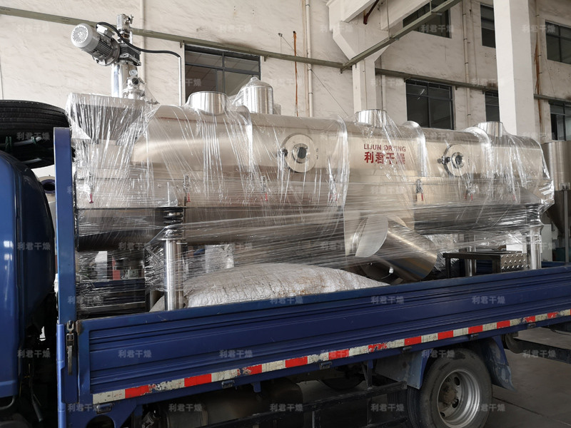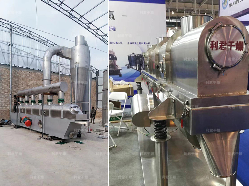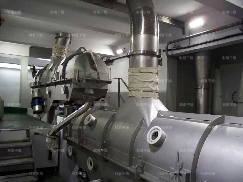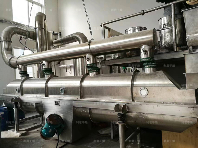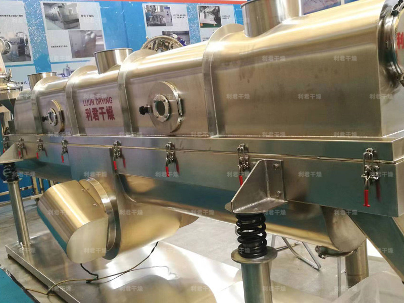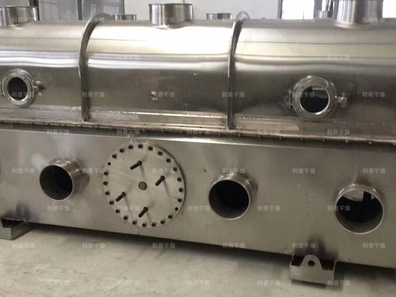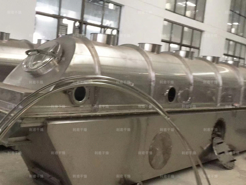 物料自進(jìn)料進(jìn)口進(jìn)入機(jī)內(nèi),在振動(dòng)力作用下,物料沿水平面流化床拋擲,向前連續(xù)運(yùn)動(dòng),熱風(fēng)向上穿過流化床同濕物料換熱后,濕空氣經(jīng)旋風(fēng)分離器除塵后由排風(fēng)1:3排出,干燥物料由排料進(jìn)口排出。
